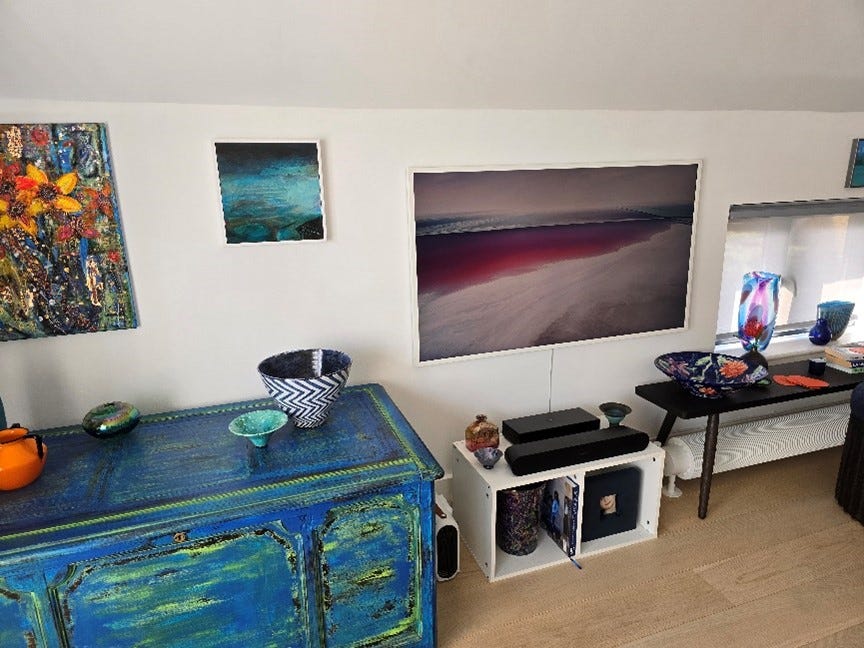 Then this, a slender wall mounted wonder that, when switched off becomes a 55” picture, displaying art. It has freed up cubic yards of the room. But for me, the “bloody hell” moment came when it sank in that the only wire required for connection, power, everything, was a small, thin, strand that you can just see below the frame.