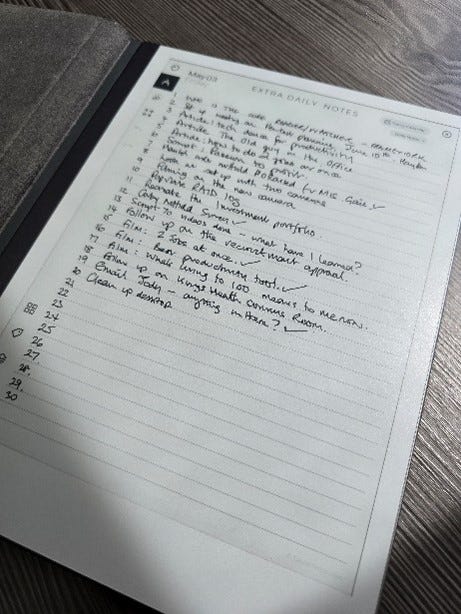 For forty-five years I have used paper notebooks for work. I create a daily to-do list each morning and write all of my other notes on separate pages during the day. Nowadays there is the added complication that with several different fingers in separate pies, I need to be able to switch seamlessly from one category of work to another. Before this tablet I could manage two work streams, one at the front of the notebook and one working from the back! Currently I have four, plus my to do list, all of which are immediately available.