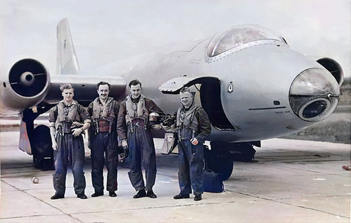 Taff: Oh yes it was a very good aircraft, but it could bite you. It had a problem with its gravity feed fuel pumps, which could starve the engines. I remember Jack (Jack Tallis – Dad’s Navigator throughout his time on the 3-man Canberra) and I were acting as targets for fighters to practice attack runs. Sometimes we were allowed to take evasive action. One time we were over the North Sea to the north of the Thames estuary, we watched a fighter closing in behind us and then I really pulled as hard a turn as I could. The pumps couldn’t manage the 'g' force and both engines flamed out! (Basically, they died).